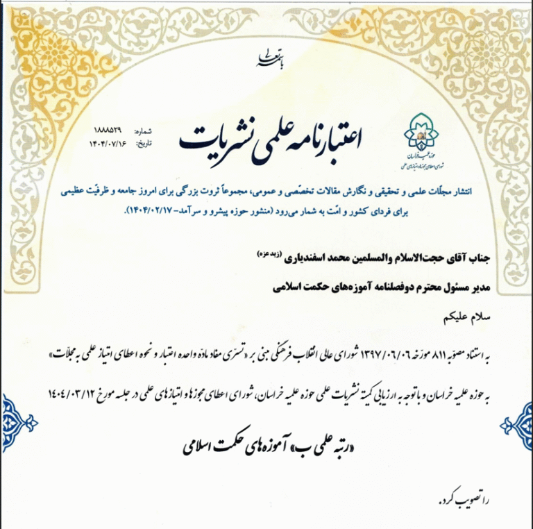 بر اساس اعلام رسمی، رتبه علمی (ب) به مدت یک سال به این دوفصلنامه اعطا شده است. همچنین، تمامی مقالات منتشرشده در دو شماره پیشین، گواهینامهای با درج این رتبه دریافت خواهند کرد که این امر اعتبار علمی آثار را افزایش میدهد و برای نویسندگان و پژوهشگران افتخاری ارزشمند به شمار میرود.